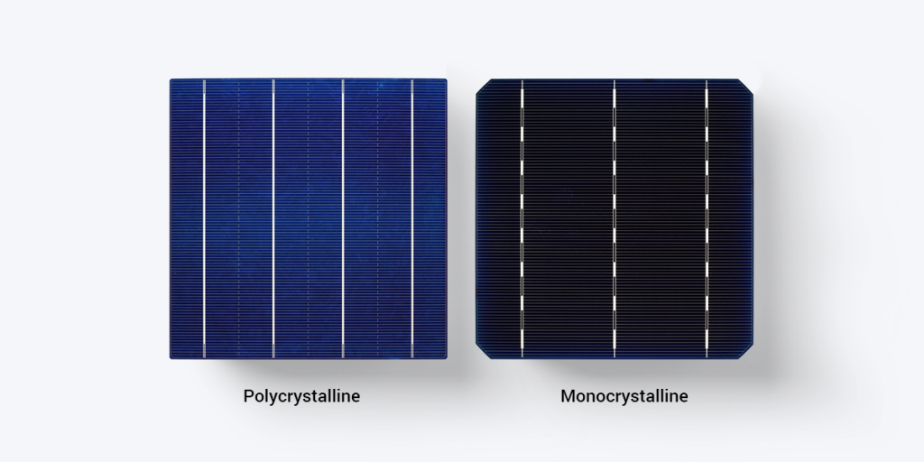 Polycrystalline cells are cheaper, but lower energy conversion to electricity efficiencies are achieved (18-19%). Polycrystalline solar cells are mainly used in mainstream solar industry – solar power plans, households and applications where price per watt is more important than generated energy from poly cell solar module per area.